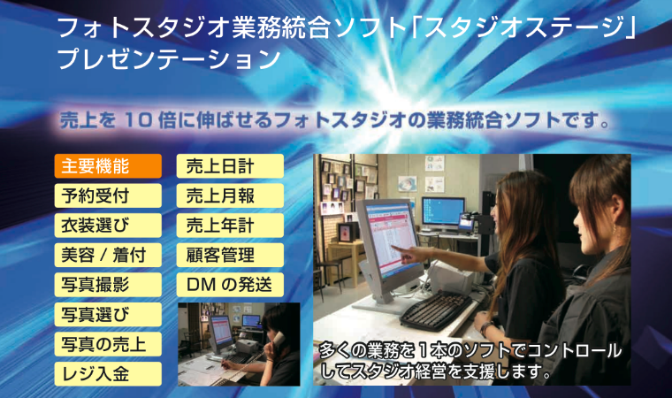 電話受付からの顧客管理、スケジュール管理、衣装管理、撮影からプレゼンセレクト処理、ラボ、アルバム製作会社への発注処理などが一括して管理が可能です。